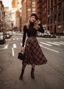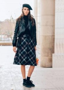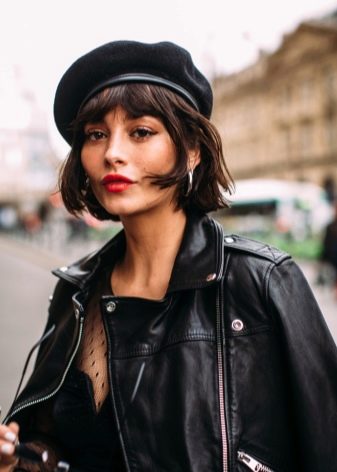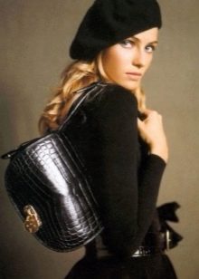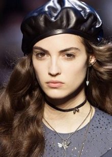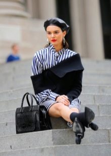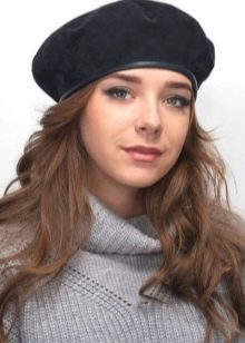 - Headpiece in black - a permanent classic that will never lose its relevance. Products of these colors may not be the main focus of your bow, but they will definitely be in harmony with the general color scheme. Of particular interest is the combination of black beret with leather goods. Also, a bow with black berets can be effectively supplemented with round glasses, burgundy or scarlet lipstick. Best of all, a black beret will be combined with leather jackets and leather trench coats in an ensemble with a dark turtleneck and a woolen skirt to the knee.