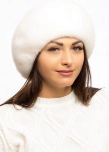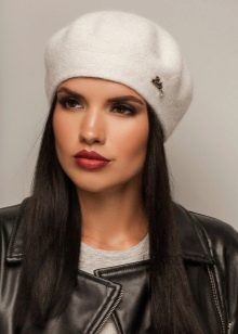- Berets of white and light colors. White is considered impractical by many, however, it is completely universal and elegantly fits into any image. Light colors will never go out of fashion, and therefore takes in the image of a girl will always look not only harmonious, but also fashionable. Such a bow can be effectively decorated with a black or blue polka-dot dress or accessories in the form of a strap and brooch.