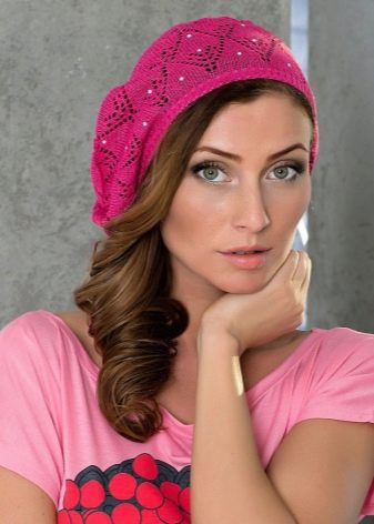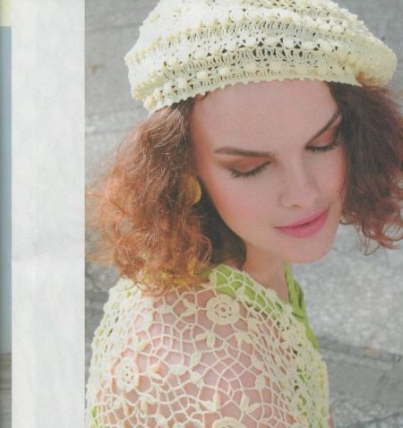 - Most common knitted berets. They can be crocheted and knitted, or even simply woven with hands.Women's fishnet, fishnet, with now fashionable "pineapples" or from exquisite Irish lace, such related things are suitable for an adult woman and a little girl, and will serve as good protection on a sultry summer day.
