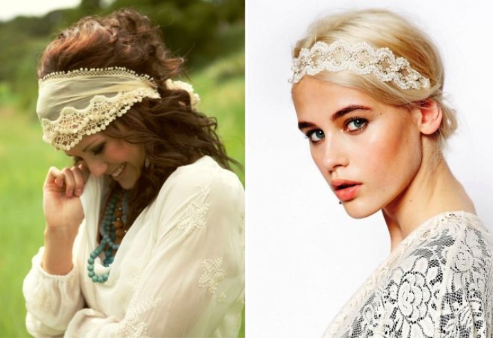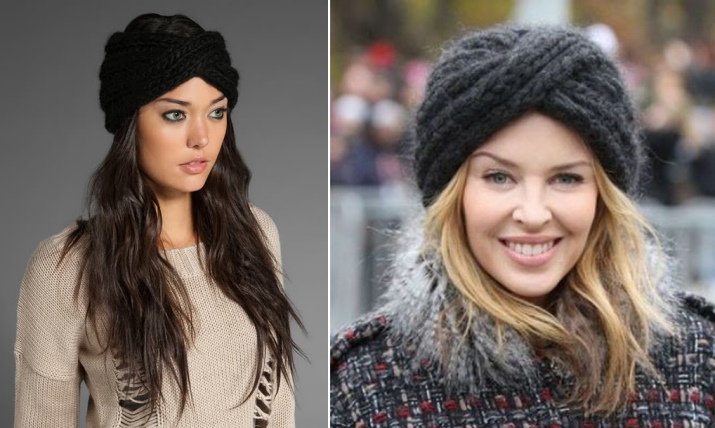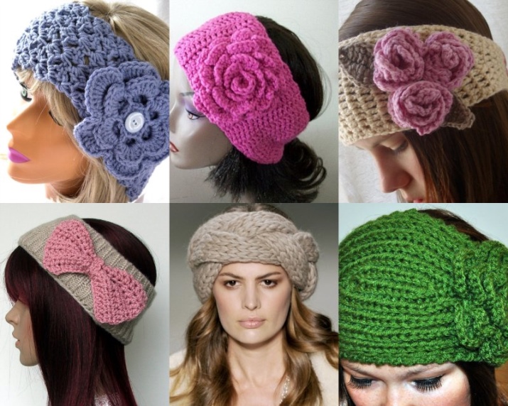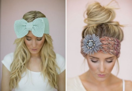 Many fashionistas put on knitted bandages under the curls, which are released on top of the product at the back. Young people prefer to wear this accessory with a high beam. A framing accessory on the head perfectly frames a stylish hairstyle. Models often adorn with a bow or flower.