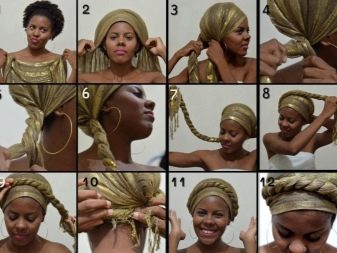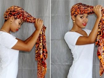 - Fold a scarf, stole or pareo in half along, throw it on the back of the head, with the ends pointing towards the face. In the frontal zone, twist them into a tight tourniquet (similar to how you twist a bath towel).