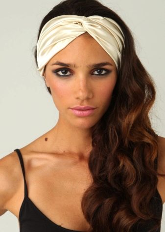 - Another beautiful exotic option: a turban with a tourniquet in golden beige tones fits perfectly with large pearl earrings and the same necklace. The emphasis in makeup is directed to the eyes.