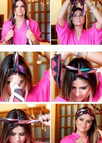 - Fold the selected accessory in the same way as in the previous case, but throw it on your forehead and take the ends to the back of the head. There, twist them with a tourniquet and, leading around the circumference of the head, return to the back of the head and tuck the tip of the tourniquet under it.