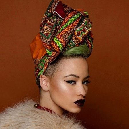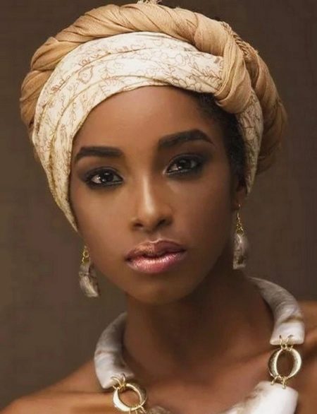 - A magnificent multi-colored turban in the African style is complemented by a pair of massive golden drop earrings. Pay attention to the make-up of the model: carefully emphasized eyebrows and bright eyes blend perfectly with almost nude lips.