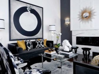 But to reduce the whole set of accessories to curtains is wrong. In a classic setting, mirrors and paintings are most appropriate. To smooth out the possible shortcomings of a black and white room, you need to choose paintings with rich, bright subjects. You can also look at the options using sconces, tapestries, panels with fabric upholstery, candlesticks.