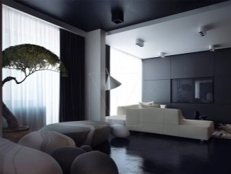 Those who want to live quietly and calmly will be satisfied with the dark colors. In the living room of people who are inclined to communicate with others, there is more often an advantage in the "bright" side. To smooth contrasts apply shades of black. But it should not be used for decorating ceilings.
