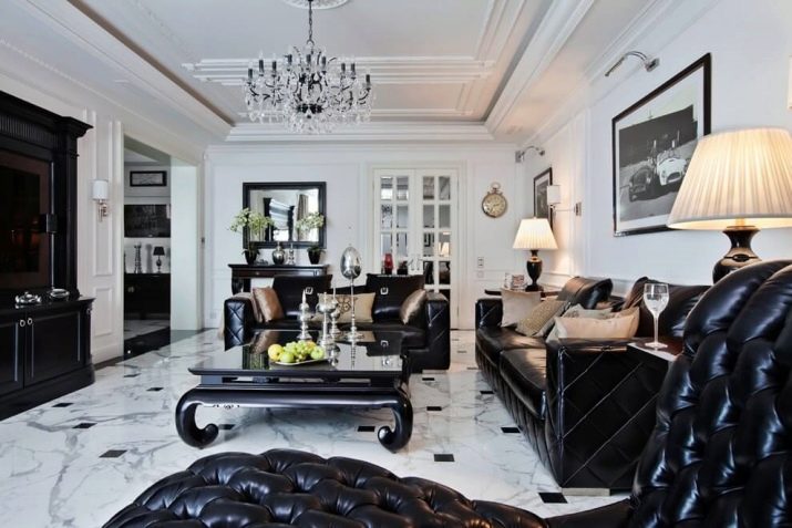 This photo shows how you can combine sharp (with pronounced transitions) multi-colored inclusions in the living room. Already a white table on a dark base looks very attractive. A black panel stands out against a relatively light wall. The performance of the chandelier shows that we are talking about the classic direction of the interior. One of the corners is completely saturated with exquisite black objects (stand, lamp).
