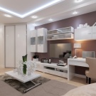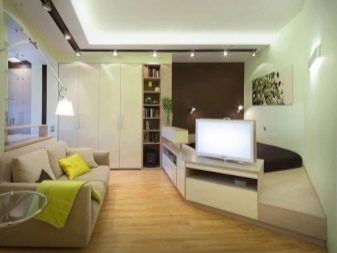 It is unacceptable to use furniture that is not directly necessary. Almost always refuse cabinets. If they are still used, then the most compact options with mirrored doors are chosen. They do otherwise when the living area is 22 square meters. m. On such an area, you can organize 2 or 3 sleeping areas and even use the remaining space for a multifunctional guest area with thoughtful storage of things.