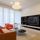 Curtains in a minimalist living room are selected only by those that do not contain any patterns or visual decorations. Only a strict concise canvas will fully comply with the design canon. Flax, cotton, lightweight muslin will be almost the best choice.