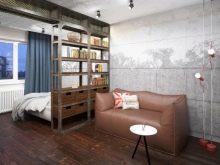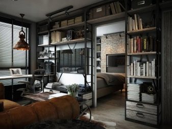 The floor can be decorated with wood materials or carpeted.The ceiling in a loft-style room should be painted the same way as the walls. This solution will ensure the completeness of the interior. Recommended for sleeping areas with wrought iron parts. To differentiate the functional parts of the room, they usually try book shelves, often complemented by antique decor.