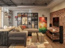 - Another attractive modern style of the apartment hall is the loft. Everyone knows that it is typical for him to use rough unfinished walls, but there are other features. Parcels in the living room are decorated with dissimilar tones. Usually the sleeping area is made darker. Bright colors are used for the dining corner.