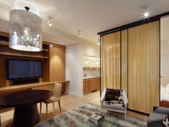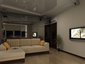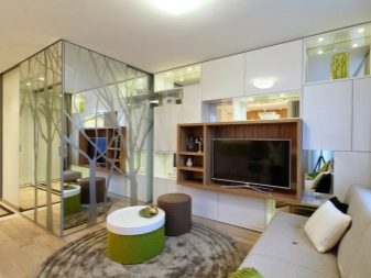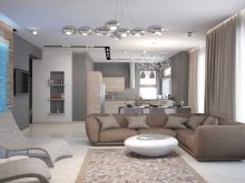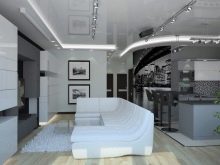 An alcove or deep niche can be used to accommodate built-in furniture. Since the extensive guest room eliminates the appearance of corridors, closets, it will be necessary to provide special areas for storing things. In a one-room apartment, you will definitely have to add a kitchen, bedroom and dining area to the hall. Therefore, you can not do without a powerful hood. Household appliances should be as quiet as possible, and an important requirement for the materials of all surfaces will be easy cleaning.