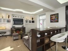 For distribution into zones, you can use corner headsets. A similar solution is recommended for the separation of the kitchen and guest areas. The back of the headset is painted in the same tone as the walls, or wallpaper is glued.But much more often they use a bar counter to separate the kitchen from the living room. Most often, the breakfast table is used both for design purposes and in practical quality.