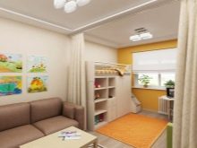 The hall can be combined with a nursery. But in this case, you will have to think about where the toys will be placed, and where the game zone itself will be located. Both of these sites should be clearly separated from the guest space. In relatively large (from 20 sq. M.) Rooms, separation of zones is achieved by partitions. In this quality, use curtains or sliding doors.