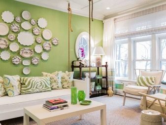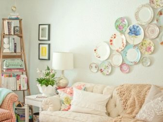 In recent years, the Renaissance has experienced such decoration of the walls of the hall as embroidery. It will be especially appropriate in the interior, where there are other hand-made things. In a country setting, it is recommended to use porcelain plates. So that they look individually, they buy blanks, and then paint them at home. Hanging plates with flowers are recommended to be used in the style of shabby chic.
