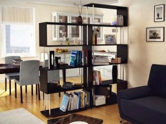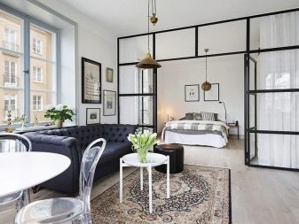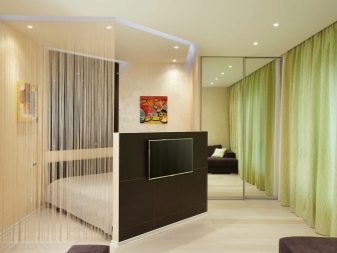 In one part of the room it will become a bookshelf, and in another - a simplified wardrobe. Separation using glass partitions is considered a modern and stylish option. However, you can guarantee a cozy atmosphere only by combining them with: