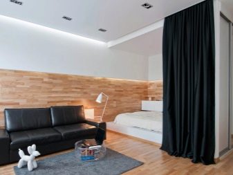 When the living area is 20 square meters. m and more combined with a sleeping area, there will be a lot of opportunities for zoning. Physical separation is achieved using curtains from various materials. Along with ordinary fabrics, light tulle can also be used. The choice largely depends on the surrounding interior. But it is worth mentioning another way of separating the sleeping and living areas: installing a double-sided shelving.