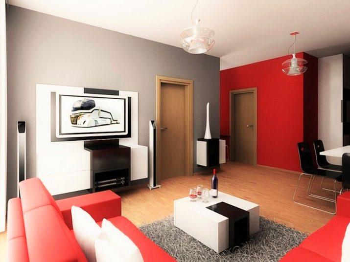 - And this hall visually refutes the opinion that the red-black space will look too defiant. Due to the competent introduction of accessories and painting one of the walls in dark gray, it is possible to eliminate all negative effects. Decorative objects and chairs of an original form may not immediately strike the eye, but they will definitely attract attention. A pair of equally arranged hanging chandeliers looks quite appropriate in this composition. And even the light wooden door tearing the gray monolith of the wall does not make an alien impression.