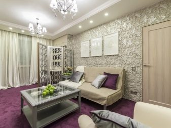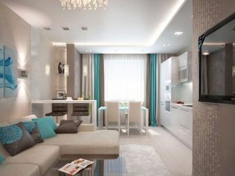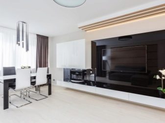 Recently, calm pastel shades have been in fashion, and bright colors are chosen in rare cases. To place all the required areas in the room and make it visually wider, preference is given to multifunctional furniture with a compact appearance. The lack of natural light is quite successfully compensated by artificial light supply systems.