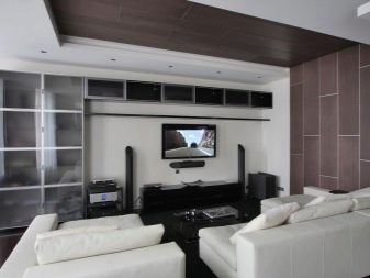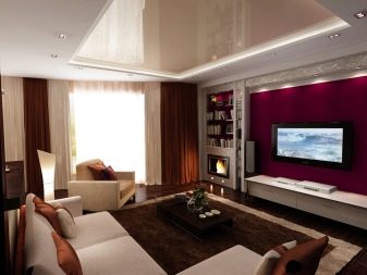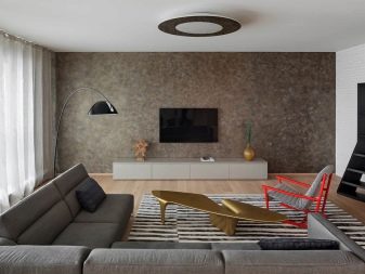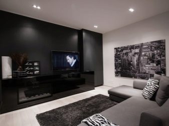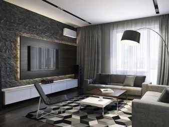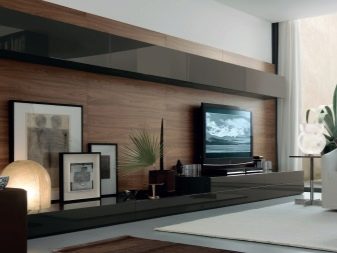 If, for example, a TV is selected, then the rest of the furniture "adjusts" to it - on the contrary stands a sofa with armchairs, a stand with a shelf or drawers appears below, tall floor lamps, compositions with plants or columns take their place, and the space above the sofa is decorated with frames with photos or pictures.