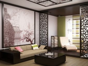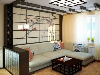 For decor, objects reminiscent of Japan are used. - for example, fans with storks and carps or images of sakura branches. The necessary atmosphere will give the presence of a paper screen, rectangular lamps and wooden figurines.