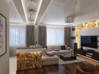 When decorating the walls of the living room, there is only one condition - the material must correspond to the chosen direction of the interior. Artificial stone, for example, will look very strange in a room decorated in a minimalist style. In most cases, for a 19-meter hall, wallpapers are selected - ordinary or combined. Thoughtful photo wallpapers also look good if an open wall is planned in the room, and the drawing meets the general idea.