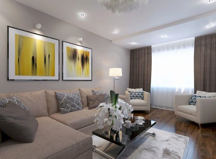 In a classic, simple interior with light colors, of furniture can be present only a large sofa, a pair of armchairs and a coffee table. The sofa is made in a pleasant beige and gray shade, and the chairs are selected in white, but all the upholstered furniture is decorated with decorative pillows with patterns of blue palette. On the soft rug is a designer table with a glossy black surface, on which not only the necessary items are stored, but also flowers are standing. Two abstract paintings in yellow-black colors are hung above the sofa, and a floor lamp stands next to it. For lighting in the living room, spotlights and a rather large chandelier are also used.