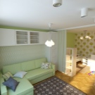 The living room combined with the children's room can be decorated in a stylish and multi-functional way, despite the complexity of the task. One of the most common methods for zoning space is considered the construction of drywall, which acts not only as a separator, but also as a place to store books and any decor. Both wall and flooring are the same throughout the room. The floor is decorated with light parquet, and the walls are painted in a pleasant pale green color. An unusual drywall construction is mounted on the ceiling, also meeting the zoning problem.