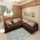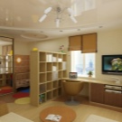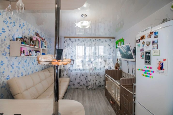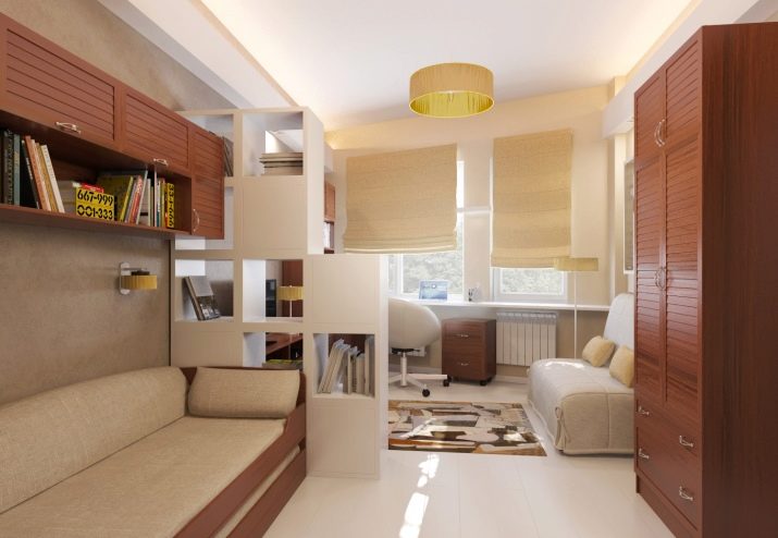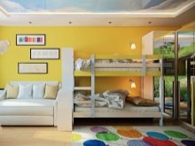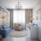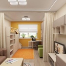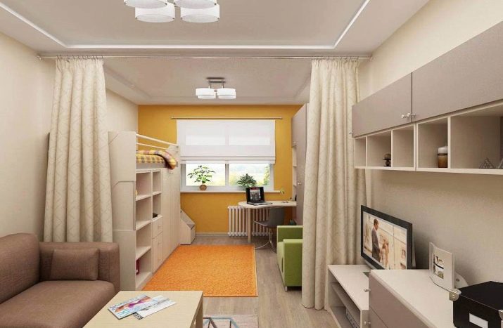 In order to provide comfort to all residents of the apartment, zoning can be done using light curtains on the floor. The presence of chandeliers with four bulbs in each zone will make it possible to provide good lighting in both parts. In the children's area, the footage allows you to place a bunk bed with a large number of cabinets, a comfortable armchair, a work desk and places for storing textbooks. The living room has a sofa, a coffee table, a TV stand and a number of hanging cabinets.