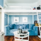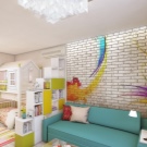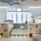 If in one room you need to place, in addition to the living area, as many as two children, then you have to be creative. The presence of numerous drywall constructions does an excellent job of this. The nursery itself is located on the podium with drawers used to store necessary things. On the left is a two-story bed, again with drawers, which is blocked from the living area by a double-sided cabinet, which allows you to arrange the necessary things on both sides. The windowsill is transformed into a large desktop, next to which is a pair of bright chairs on wheels.