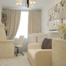 The lighting in the combined room is uniform and consists of spotlights around the perimeter, a designer chandelier in the middle of the ceiling, as well as lights on a plasterboard design. In the children's area there is a folding sofa for a student in beige, a desk with cabinets, a chair on wheels and hanging shelves. For furniture, shades are applied that are the same for the entire interior: pale green, white and beige.