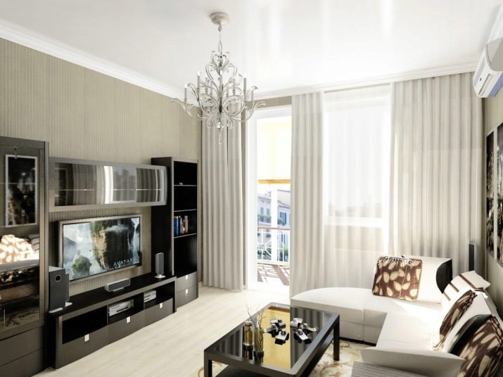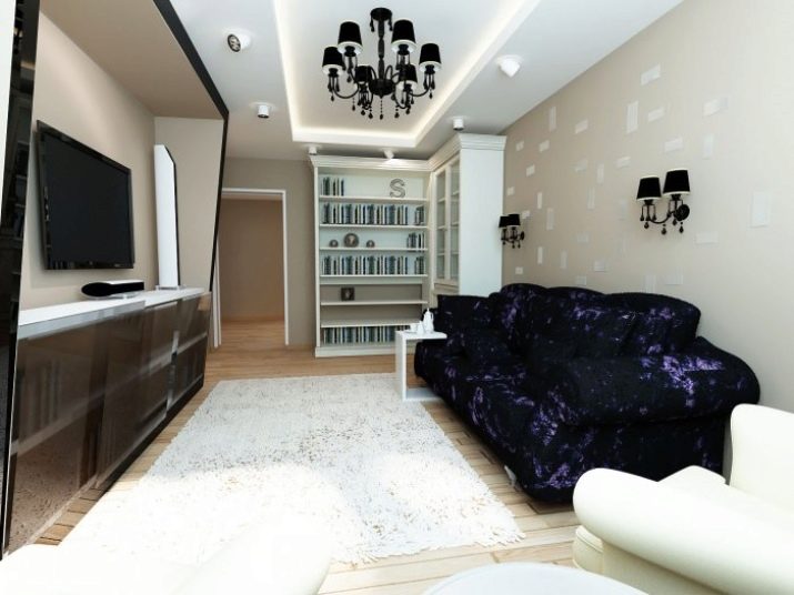 If your living room is elongated but narrow in shape, then you can place a spot with a metal elongated frame on the ceiling. Such structures are mounted along the entire length of the room. If the space is too large, then it is permissible to install in it immediately two such lamps opposite each other. At the same time, it is not recommended to mount a large chandelier.