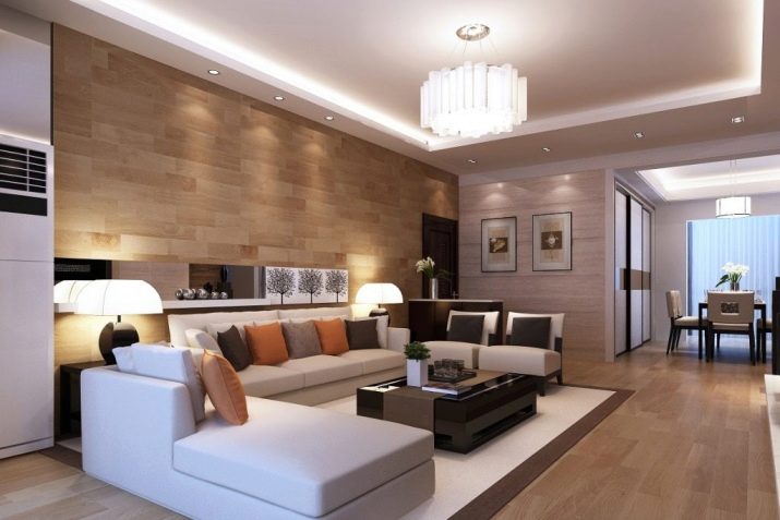 If your living room is combined with the kitchen, then a large chandelier in the living area will be an interesting option. When moving to another part, you can install several spotlights in a certain order.