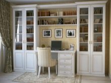 - The workplace between the two windows will look good. A big plus will be natural light, compact space, as well as the fact that you can often ventilate the room. Storage blocks of different formats can be easily placed in the wall.