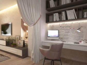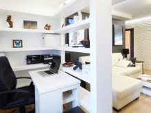 You can equip your working area by identifying areas in the living room and thinking through a harmonious combination of colors. The workspace can be separated from the recreation area with the help of partitions, light, shelving, ceiling (to make a different level), as well as curtains and other structures. A specific place is selected based on the characteristics of the room. Typically, a TV and computer desk are nearby.