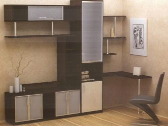 - If there is a furniture wall in the room, then the table for the computer can be a good continuation of the design. The workplace may be where the rack is. It can accommodate office equipment, documents and stationery. The tabletop, which reclines, looks practical.