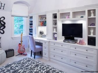 - If the room has a bay window, then you can put a round table for the computer, as well as a wardrobe. Lighting can be adjusted using blinds.
