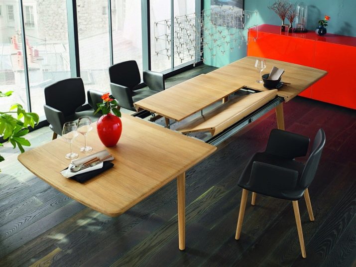 A beautiful and durable sliding table in the hall becomes an interior decoration and is always ready to receive guests. With a simple movement, its area can be almost doubled. If the kitchen is combined with the living room, the table serves as a dining room. For daily use, it is used when folded.