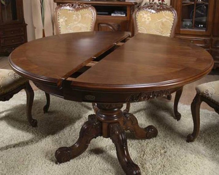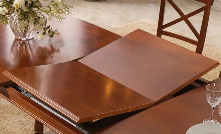 - In some models, the central part of the table is divided into two halves. Having spread the table, an additional section is manually laid out like a book.