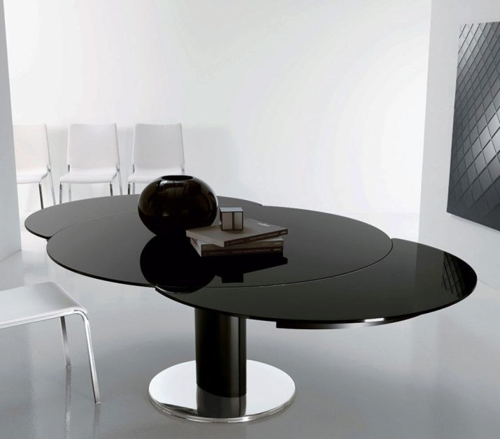 - The round glass table extends in a non-standard way. Ideal for a minimalist interior in black and white.