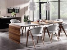 - Countertops made of glass or with a mirror effect can add shine to the room. To this table fit wooden chairs. It is important to make sure before buying a table made of this material.