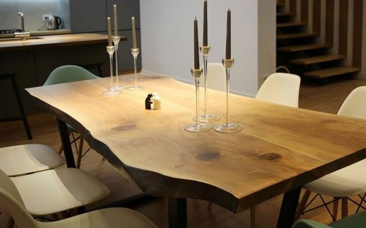 - If you opted for a tabletop made of natural wood, for example, from a solid and roughly processed array, then such a table will play the role of the main accent in the room.