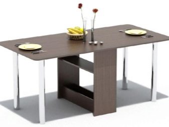 The table consists of a stationary department and two wings, which are laid out. They are located on the sides, and, rising, are located on a support, the role of which is played by the legs. You can lift only one or both side parts of the countertop. There can be either one or two legs, while in the second case the table will be more stable.