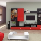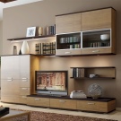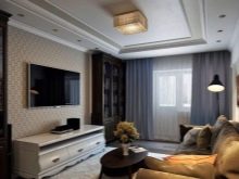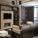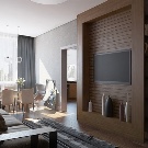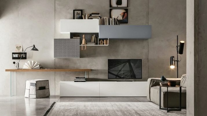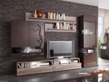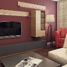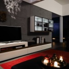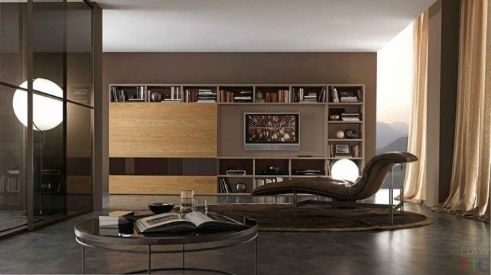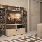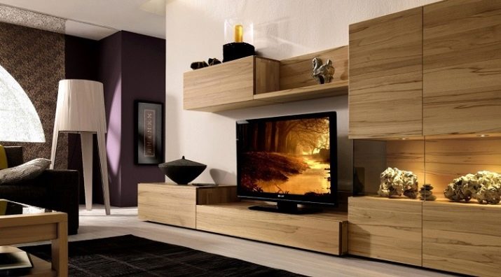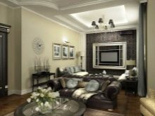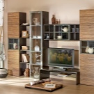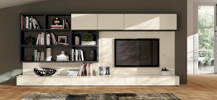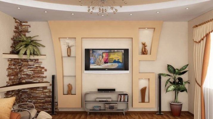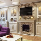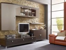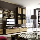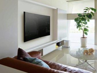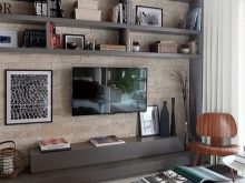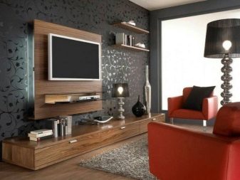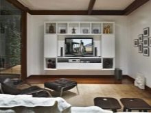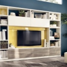 Someone prefers to install the plasma panel in the headset for the living room, equipped with dedicated sections, providing for closing the TV from prying eyes. It is possible to design a zone using side tables on a half wall and a wall panel with cantilever shelves. It is preferable to take the cabinet with closed shelves, which can be used for storage of any things.