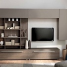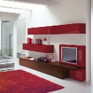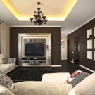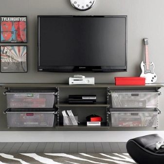 An unusual solution will be the creation of a TV zone with the help of shallow hinged boxes of concise design, in which it will be possible to remove small objects of arrangement. For example, you can build a rectangular box-zone, put a TV on its lower part. On the sides you can arrange the necessary players and create narrow shelving shelving type for books.