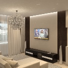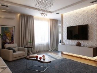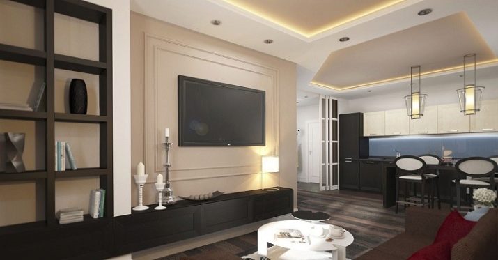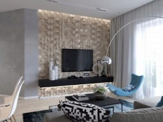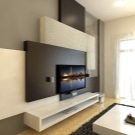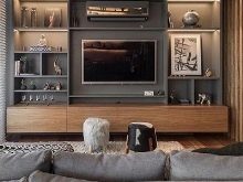 You can make a television zone in the hall combined, using different elements for its design (for example, shelves, a niche, shelving). You can hang the TV on the wall, place a large hinged shelf under it and highlight it from below.