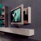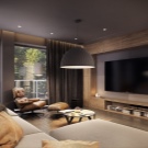 The modern design of the living room TV area should be part of the interior composition of the entire room. It should be sustained in a single style, color scheme. Someone prefers to mask the technique as a picture with dynamically changing images of paintings by eminent artists or create their own gallery of their family photos. Passe-partout is created with different frames and modes, adjusting the model to a specific palette of interior design.