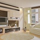 A great way to emphasize the video space is the use of wall cladding, contrasting the main background decoration of the living room interior. It is important to consider that this is best done when the room is spacious. So the emphasis will look aesthetically attractive without creating ripples in the eyes.