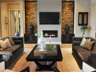 If the walls are solid, but the installation of a TV is planned on a ledge between two wall niches, the boundaries of this video zone can be marked with stone and on the sides, by lining the niches themselves. You can supplement the composition with a fake-skin or even a stand, a shelf, floor vases, or even a chest of drawers.