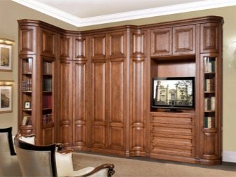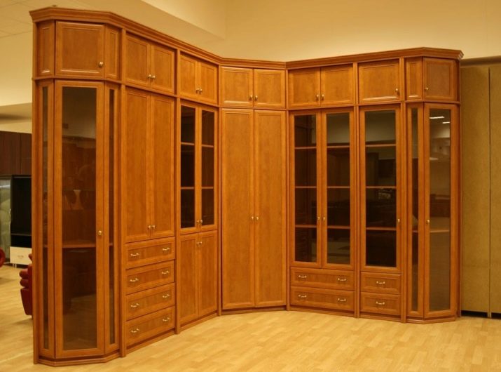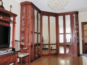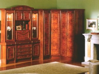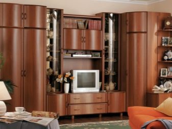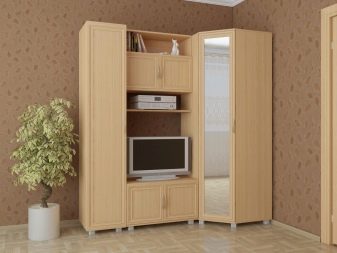 Cabinet furniture familiar to everyone is represented by sections that can be purchased as a large corner set, as well as select the necessary elements and make up a compact set. During assembly, the sections are fastened together to form a uniform wall. In the center of the furniture assembly may be any section made in the form of a corner - a cabinet, a showcase, a sideboard, a TV stand. If you choose furniture with a corner cupboard, it can replace a small dressing room.